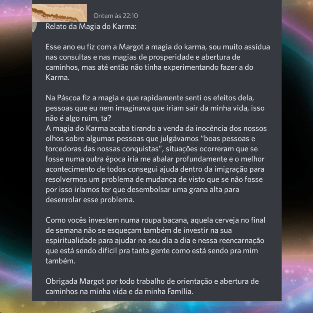 E para quem tem dúvida, vai aí um depoimento de quem fez a magia do karma este ano. E lembrando que no Discord, temos centenas de depoimentos para que vocês confirmem, além dos próprios membros para falar sobre elas.